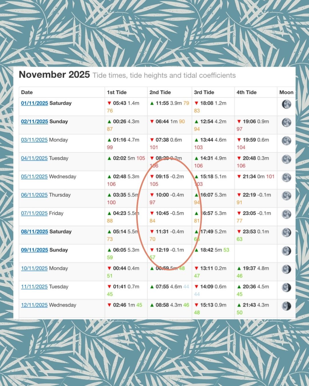 Watch for tides below 0 m, usually happening around the new moon or full moon. These are the days when the sandbanks form at their best.